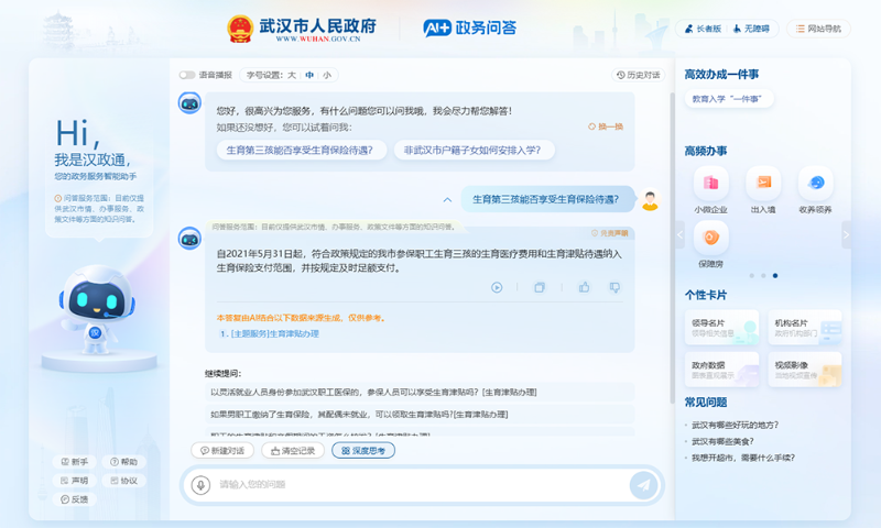 為響應(yīng)國(guó)務(wù)院關(guān)于“高效辦成一件事”的總體工作部署,深入推動(dòng)政務(wù)服務(wù)提質(zhì)增效,武漢市政府搶抓認(rèn)知智能大模型發(fā)展趨勢(shì),攜手龍訊科技,結(jié)合目前武漢市人民政府網(wǎng)站智能問答現(xiàn)狀,通過引入人工智能技術(shù),打造一個(gè)有問必應(yīng)、服務(wù)周到的智能問答服務(wù)平臺(tái),用窗口化的服務(wù)架起又一座與群眾溝通的“連心橋”,實(shí)現(xiàn)讓數(shù)據(jù)多跑路,讓群眾少跑腿,讓民政服務(wù)變得更有溫度。從而提高政務(wù)咨詢的效率和質(zhì)量,優(yōu)化用戶體驗(yàn),提升政務(wù)信息公開和透明度,加強(qiáng)政府與公眾的互動(dòng)和溝通,推動(dòng)政務(wù)數(shù)字化轉(zhuǎn)型,為公眾提供更加便捷、高效、智能的政務(wù)服務(wù)。