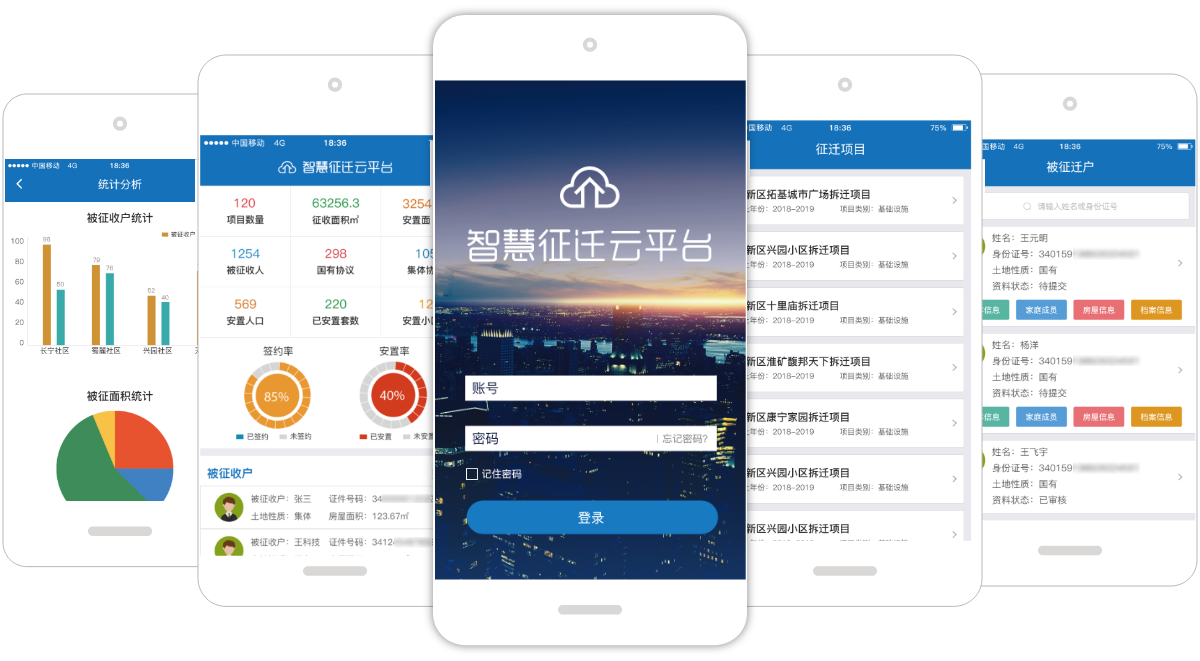 龍訊智慧征遷云平臺以打造“陽光征遷”的征遷新模式為目標,利用最新信息通信、云計算、大數據等信息數字化技術,切實解決“項目流程進度,難把控”、“數據匯總檔案,難管理”、“信息匯總公開,難及時”等征遷安置工作難點,通過規范的可執行的流程助力實現征遷安置程序規范、信息披露及時、過程陽光透明。